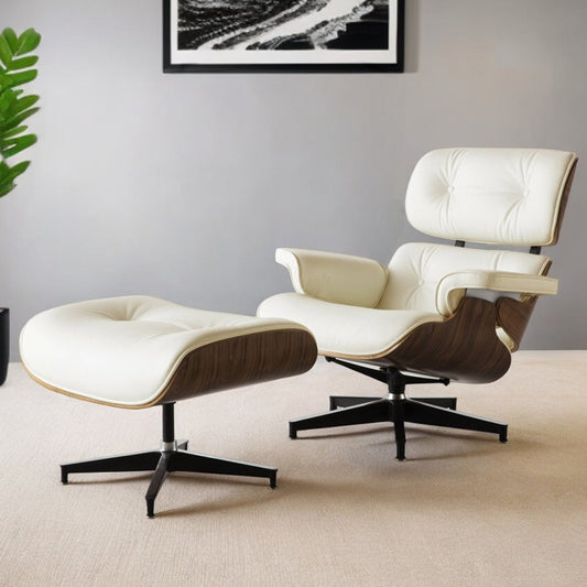 35" Beige and Dark Brown Genuine Leather Tufted Swivel Lounge Chair With Ottoman