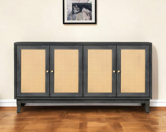 65" Charcoal and Natural Wood and Rattan Sideboard with Four Doors