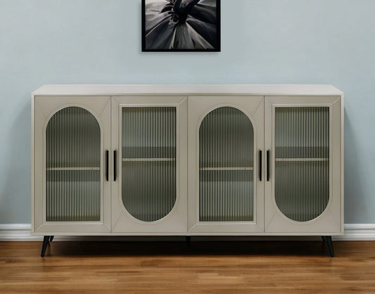 60" White Ribbed Texture Wood And Glass Sideboard with Four Doors