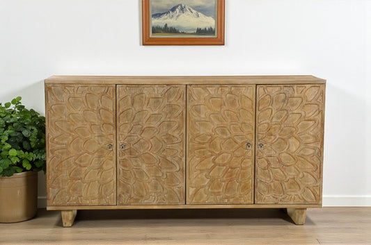 60" Natural and Brown Distressed Carved Geometric Sideboard with Four Doors