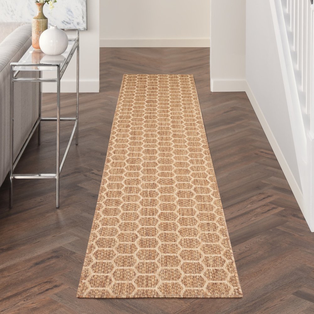 Add some artistry to your room with this 10-foot natural and beige geometric indoor outdoor runner rug. This runner shaped rug features a geometric design that will work well both indoors or out. A classic shape marries with a good-looking design for your living room, hall, bedroom, porch, patio, or poolside. Makes a great way to dress up your patio, porch, or poolside, but also works well as a durable and easy to maintain option in the kitchen, family room, or mudroom. 26-inch h x 120-inch w x 0.23-inch d.