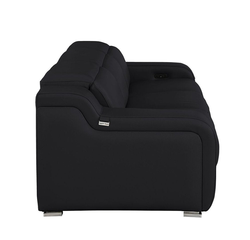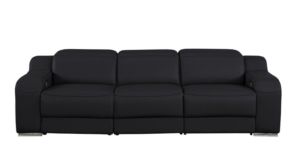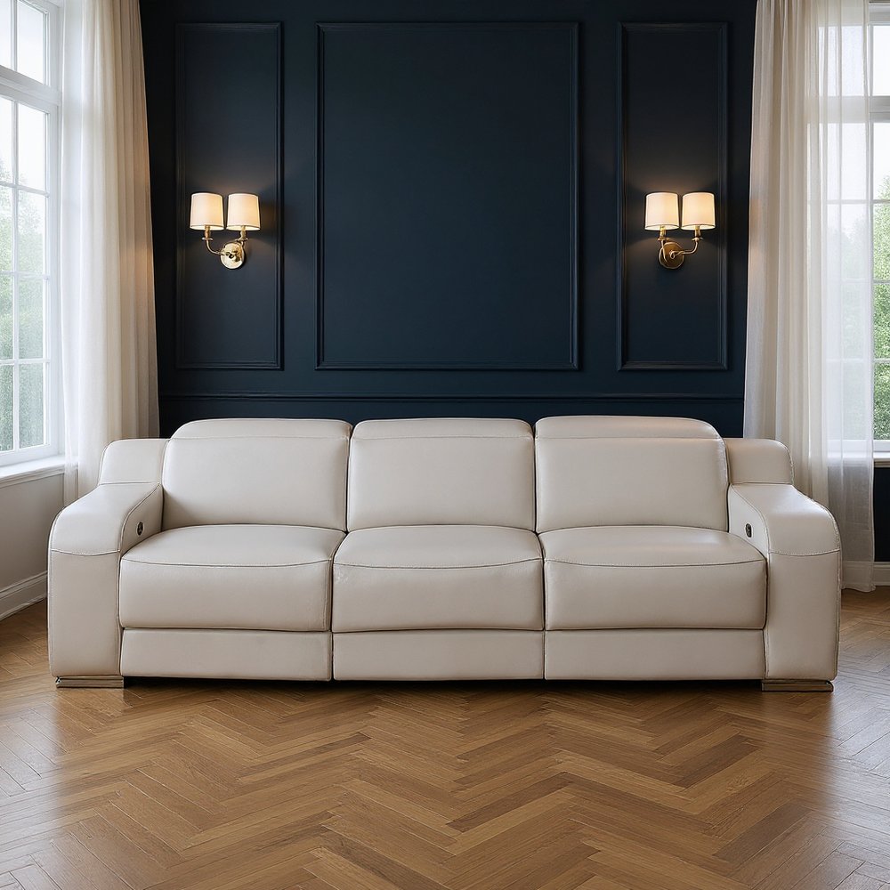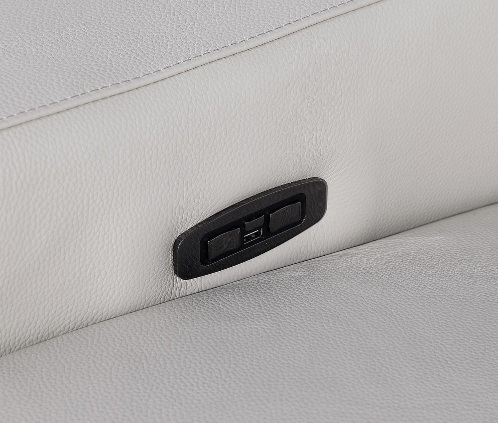 Superior construction from fabulously soft and high-grade leather gives this 103-inch light gray Italian leather reclining USB sofa with silver legs a leg up on the competition. The premium leather used makes your lounging luxuriously comfortable and adds an elegant appeal to your space. Dual power recliners, adjustable headrests, and pocket spring construction give this piece strong support and makes it comfortable to sit even for long periods of time. Fixed arms offer a comfy place to rest. Clean lines and silver stainless steel legs effortlessly elevate the room and add a touch of contemporary design. A great showpiece for your room, this sofa is a must have. 30-inch h x 103-inch w x 41-inch d.