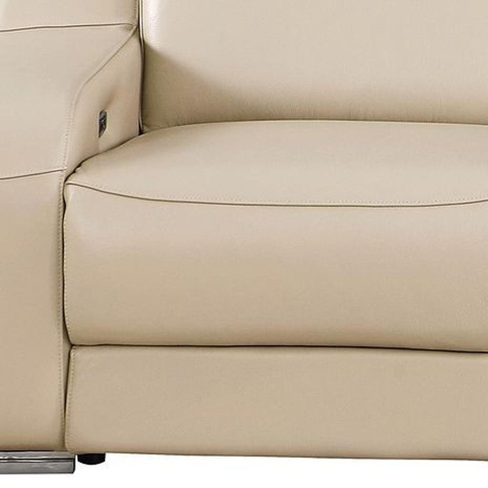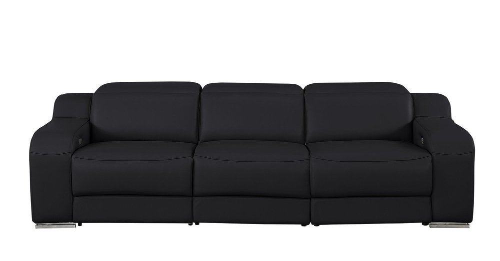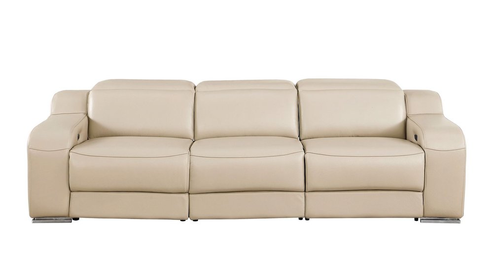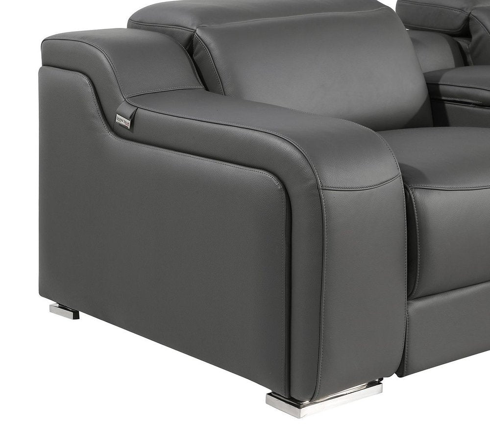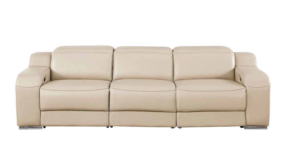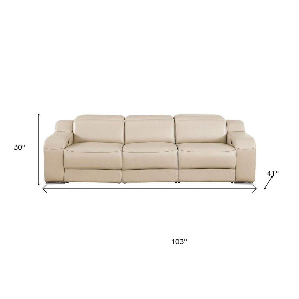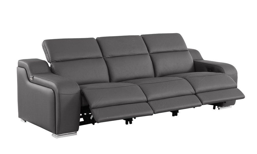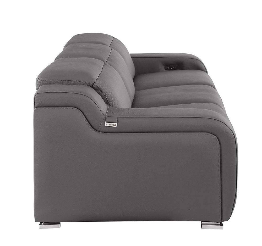 Superior construction from fabulously soft and high-grade leather gives this 103-inch light gray Italian leather reclining USB sofa with silver legs a leg up on the competition. The premium leather used makes your lounging luxuriously comfortable and adds an elegant appeal to your space. Three power recliners, adjustable headrests, and pocket spring construction give this piece strong support and makes it comfortable to sit even for long periods of time. Fixed arms offer a comfy place to rest. Clean lines and silver stainless steel legs effortlessly elevate the room and add a touch of contemporary design. A great showpiece for your room, this sofa is a must have. 30-inch h x 103-inch w x 41-inch d.