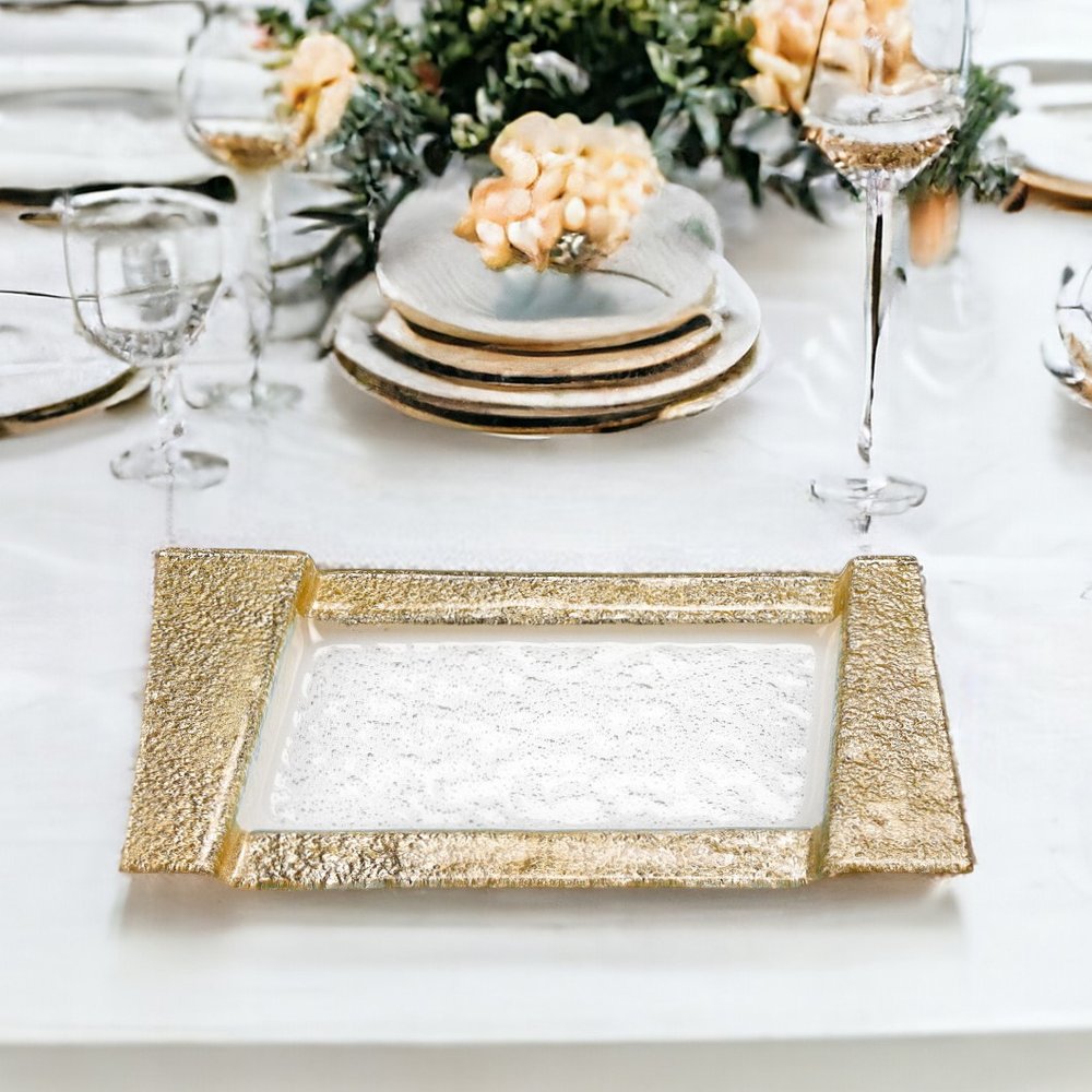 Bandeja para refrigerios o tocador de vidrio transparente y dorado de 13"