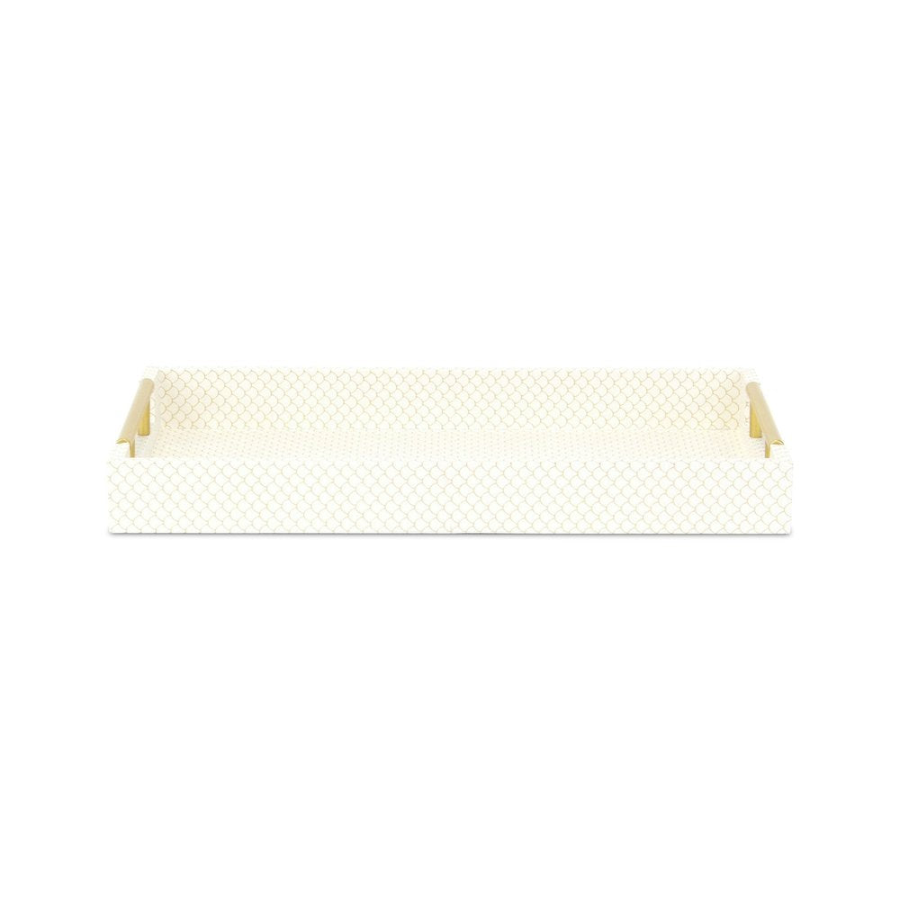 Esta bandeja para servir de 40 cm, hecha a mano, con estampado geométrico en marfil y dorado y asas, añadirá un hermoso toque decorativo a su decoración. Su hermoso diseño geométrico realza su atractivo y calidad decorativa. Cuenta con asa para un transporte rápido y fácil. Diseñada exclusivamente para uso decorativo, no alimentario, es la pieza decorativa perfecta. 4,4 cm de alto x 39,5 cm de ancho x 23,2 cm de profundidad.