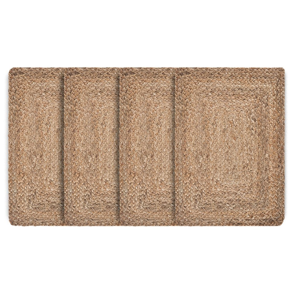 19-inch set of four natural jute placemats adds a rustic charm to your dining experience. Each placemat is handmade from durable jute, ensuring quality and uniqueness in every piece. The rectangular shape fits perfectly on any table, providing a stylish backdrop for your dinnerware. This traditional design complements a variety of home decor styles, making it a versatile choice for any occasion. The natural color enhances the organic feel, seamlessly blending with other elements in your dining space. This set includes four placemats, making it ideal for family gatherings or elegant dinner parties. Elevate your dining table with this beautiful set that combines functionality and aesthetics without compromising on style. 13-inch h x 19-inch w x 0.3-inch d.