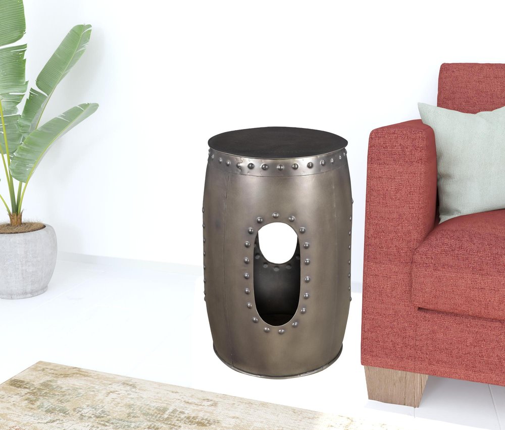 Distinctive in style the 20" nickel iron round end table radiates a versatile charm. This table is made from iron in a nickel color throughout the base and top. An ideal location for placing your snacks and drinks, and a place to keep your lamp, frames, or other accessories. This versatile table is a great accent for most any room. 20" H x 16" W x 16" D