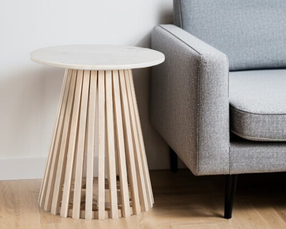 Distinctive in style the 20-inch white and natural distressed marble and solid wood round pedestal end table radiates a versatile charm. The white marble top of this table is a nice contrast to the high quality, natural solid wood of the base. Complete with a purposefully distressed finish, this table has an aged, vintage, and rustic feel. Side tables are a great way to flank your sofa, use as an accent next to your favorite chair, or can even be used bedside. You can match it with other pieces to get the ideal look for your place. 20.1-inch h x 19-inch w x 19-inch d.