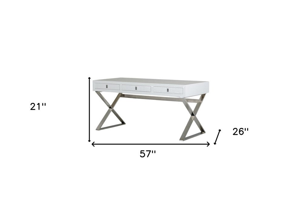 When you want to beautify your work, or study, space with something both gorgeous and practical, youre at just the right place. This desk complements any area in which it finds itself with its contemporary design and appealing appearance, while its composition makes it a perfect multifunctional tool. Its made from durable white MDF and steel. Furthermore, it has three drawers for maximum storage space. As for measurements, they are 21 for height, 57 for width, and 26 for depth, and it weighs 136.3 pounds. You can match this desk with other decorations to get an ideal look for your space. If youre looking for something to help you create a cozy environment for yourself, this desk is for you.