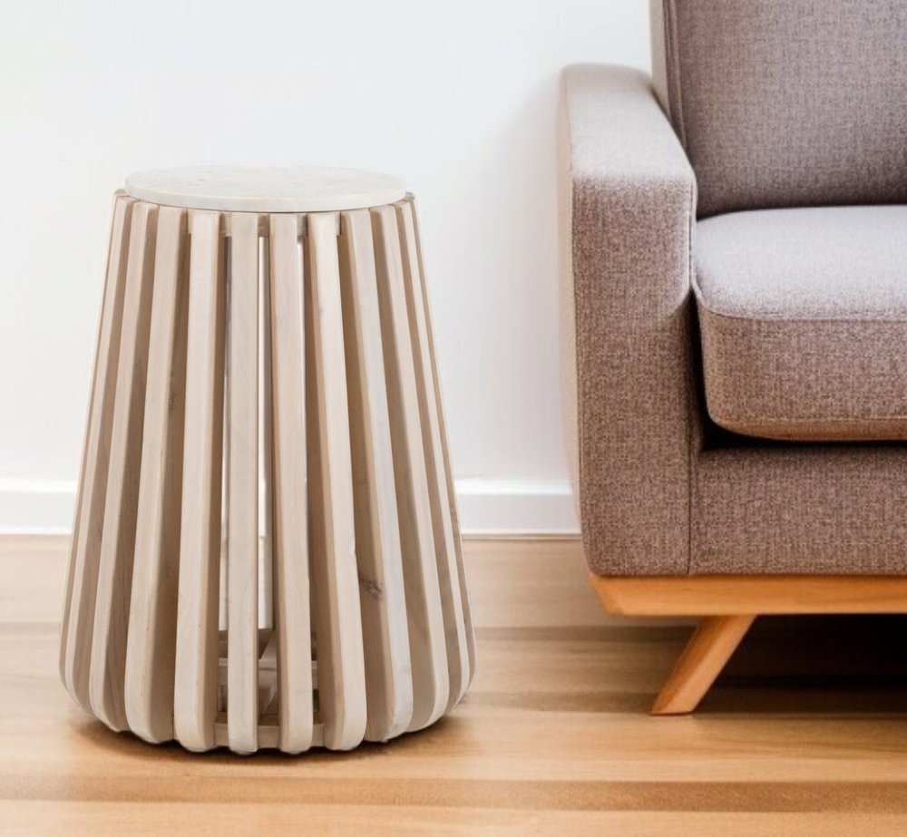 23" White and Natural Distressed Marble and Wood Round Drum End Table
