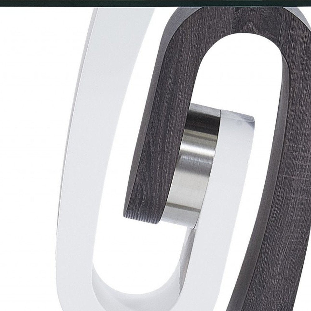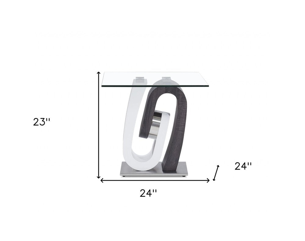Show off your exquisite taste with this 23-inch white gray and clear glass and wood square pedestal end table. A unique contemporary shaped white and gray solid and manufactured wood frame is finished off with a clear glass top that is the epitome of quality construction and design. An ideal location for placing your snacks and drinks, and a place to keep your lamp, frames, or other accessories. You can also use it as an entryway table to hold your keys. 23-inch h x 24-inch w x 24-inch d.