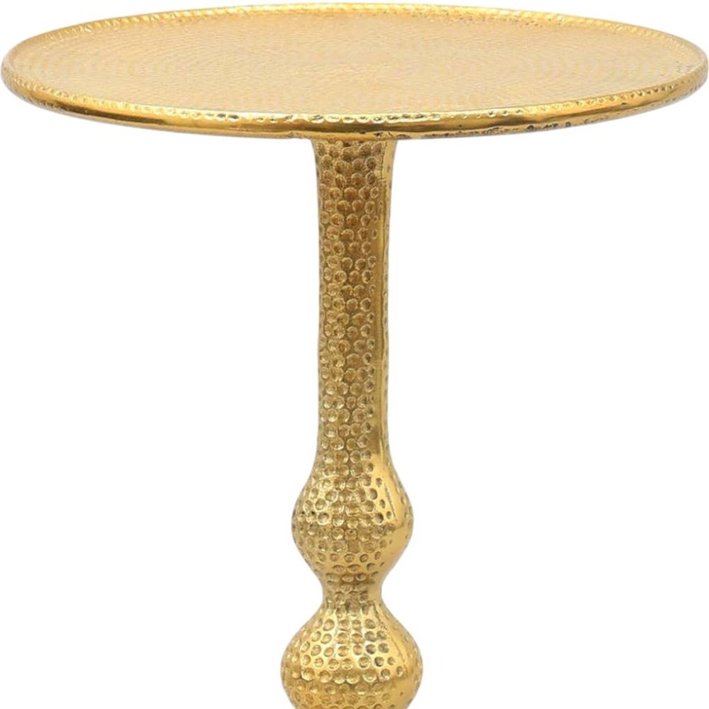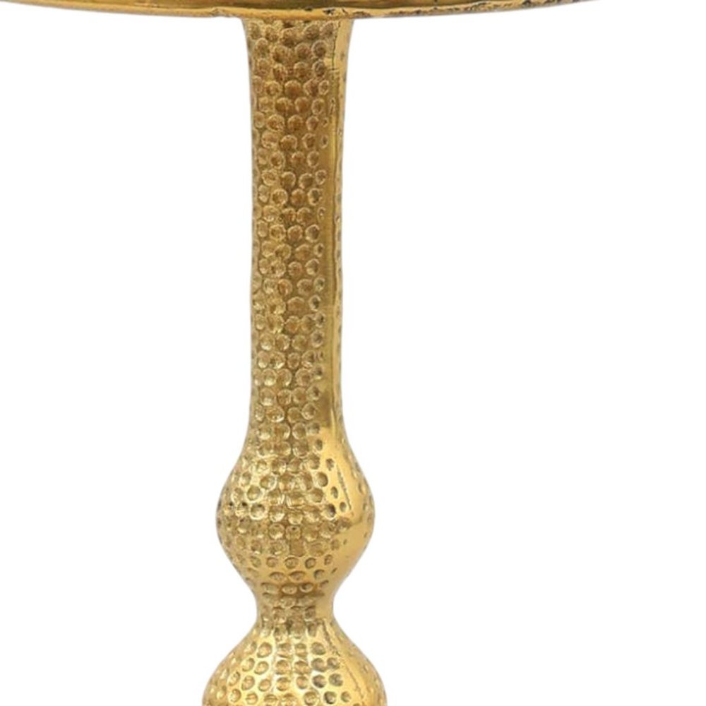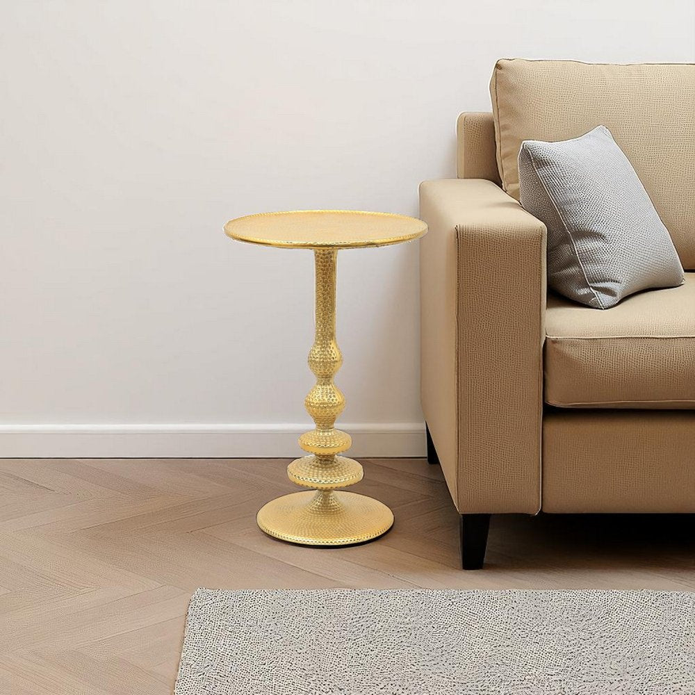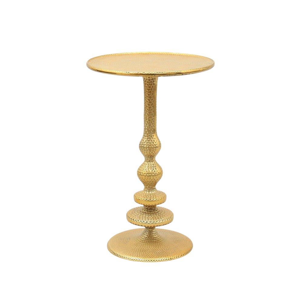 Distinctive in style the 24-inch gold aluminum round pedestal end table radiates a versatile charm. Made of aluminum, the antiqued gold coloration and hammered texture throughout gives this piece an updated and refreshing look. An ideal location for placing your snacks and drinks, and a place to keep your lamp, frames, or other accessories. This versatile table is a great accent for most any room. 24-inch h x 16-inch w x 16-inch d.