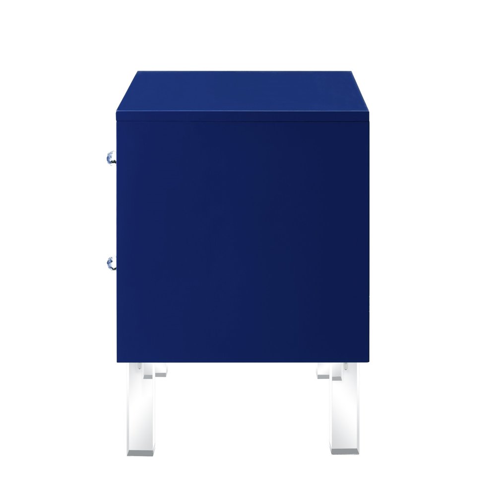 Optimize your space and add some charm to your room with the 24-inch navy blue and clear wood and acrylic end table with two drawers. The glossy blue lacquered finish wood is a nice contrast to the high quality, clear acrylic of the legs. Includes 2 easy open drawers for storage of the small essentials. A great accent on either side of the sofa or bed, this adorable end or side table is just what you need. You can also use it as an entryway table to hold your keys. 24-inch h x 27-inch w x 18-inch d.