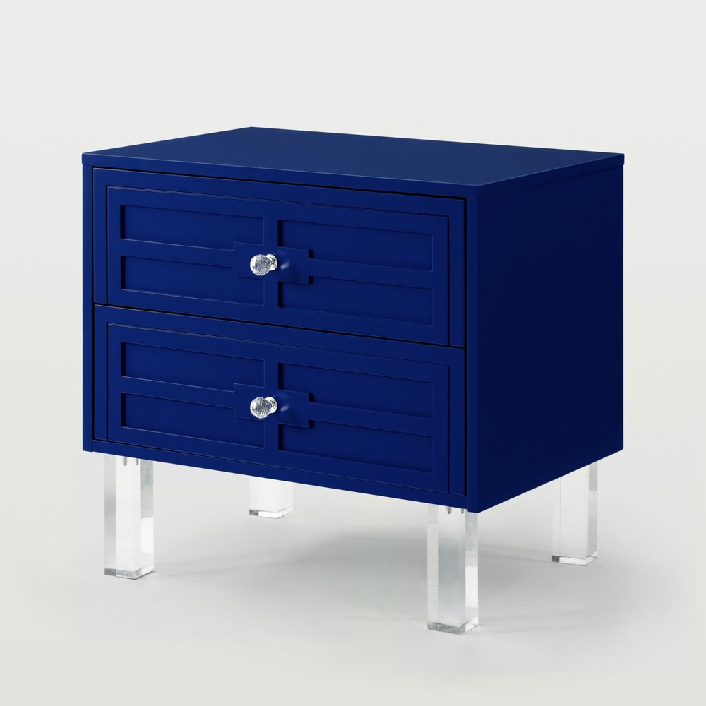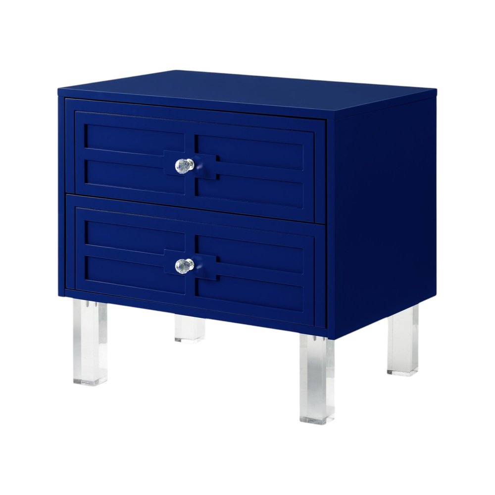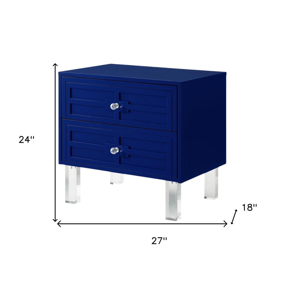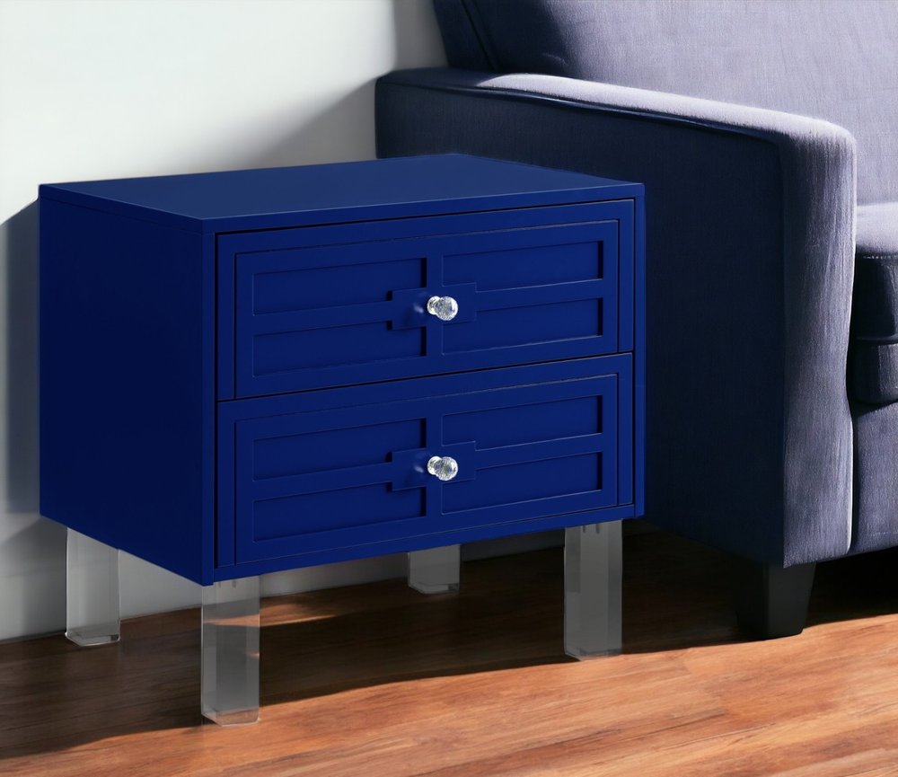 24" Navy Blue And Clear Wood And Acrylic End Table With Two Drawers