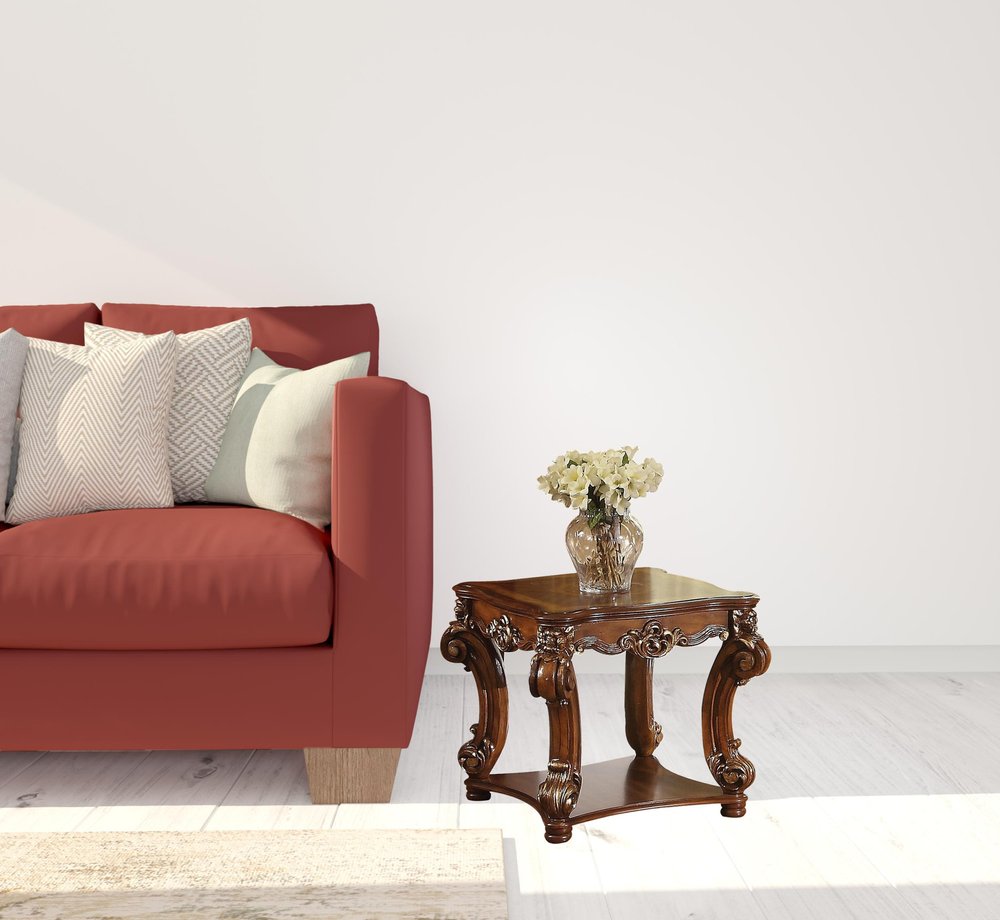 Show off your exquisite taste with this 26" scrolled cherry manufactured wood and solid wood square end table with shelf. This end or side table is expertly made from high quality solid wood. A sleek cherry monotone color gives this solid wood and manufactured wood table a fresh and updated look. Includes a single shelf for handy storage or display space. An ideal location for placing your snacks and drinks, and a place to keep your lamp, frames, or other accessories. This versatile table is a great accent for almost any room. 26" H x 31" W x 31" D