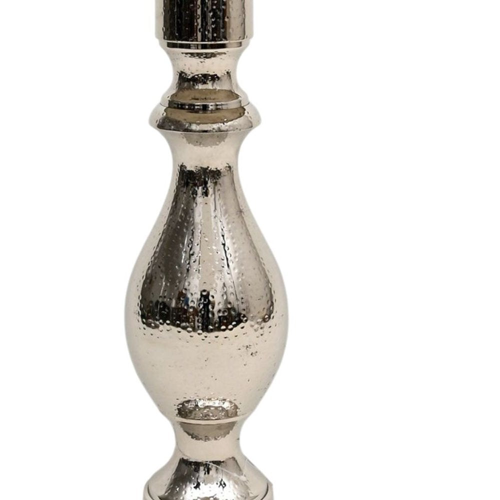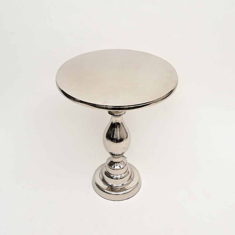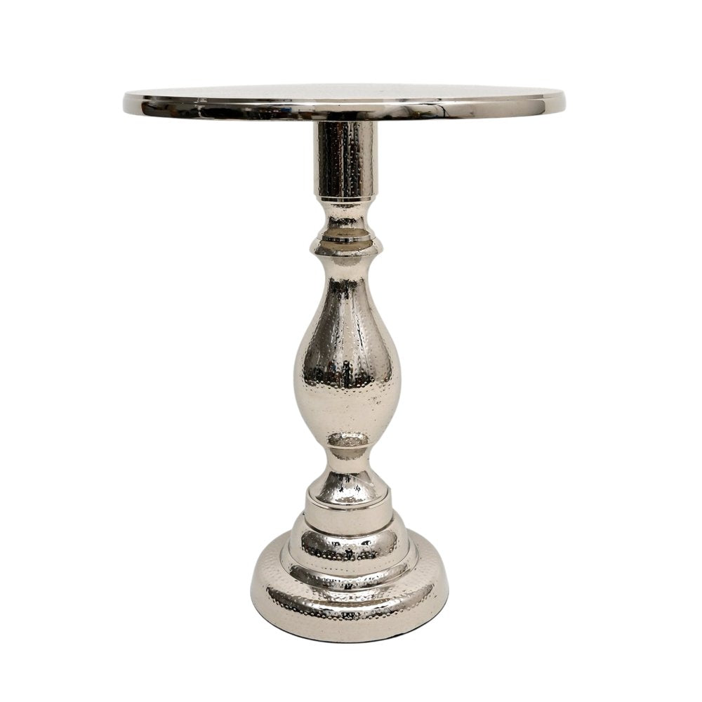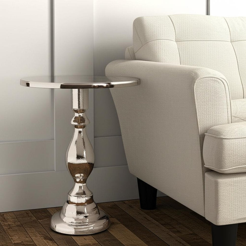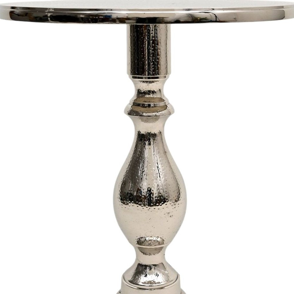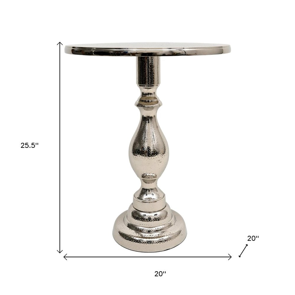 Optimize your space and add some charm to your room with the 26-inch silver aluminum round pedestal end table. This table is made from aluminum in a silver color throughout the base and top. The hammered textural and purposefully distressed finish gives this table an authentically rustic feel. A great accent on either side of the sofa or bed, this adorable end or side table is just what you need. This versatile table is a great accent for most any room. 25.5-inch h x 20-inch w x 20-inch d.