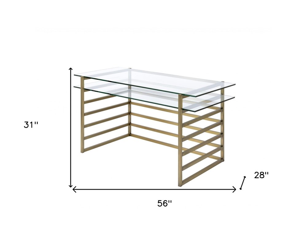 Designed to easily fit into most spaces, this classically shaped rectangular desk will turn your room into a productive workspace. Built to last, this sturdy desk, featuring a clear glass top and mirrored base, effortlessly combines modern style with durability. The sleek metal base ensures stability while adding a touch of elegance. Perfect for creating a contemporary and efficient work environment, this desk is the ideal choice for those looking for both functionality and sophistication in their home office setup. 31-inch H x 56-inch W x 28-inch D