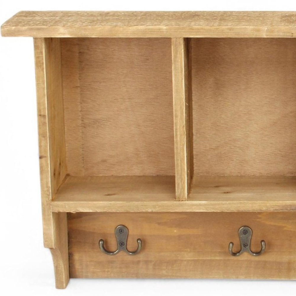 El perchero de pared de madera natural de 76 cm con cuatro ganchos combina a la perfección funcionalidad y estilo. Este sistema de almacenamiento de pared cuenta con un estante superior, compartimentos abiertos y cuatro ganchos resistentes, ofreciendo amplio espacio para abrigos, sombreros y bolsos. Su acabado envejecido de madera natural añade un toque cálido y rústico a tu espacio. Con un diseño compacto que se monta directamente en la pared, ahorra valioso espacio en el suelo y mantiene la entrada organizada. Ideal para quienes aprecian la practicidad y la estética, este centro de almacenamiento colgante combina a la perfección utilidad con un encantador estilo rústico. Organiza tus pertenencias con elegancia y añade carácter a tu hogar con esta hermosa pieza. 37 cm de alto x 75 cm de ancho x 10,8 cm de profundidad.