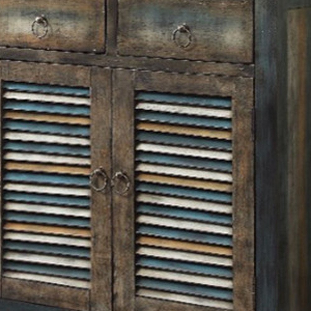 add this functional piece to the corners of your living space in order to create a unique setting. creatively crafted from wood to put a vintage touch on any home decor. the rectangular console table features a wooden top, three drawers and a bottom shelf meant to help keep your favorite knickknacks safe. tastefully finished in antique white and teal, this charming piece is complemented by wooden straight legs for sturdy support.