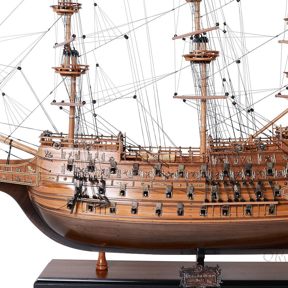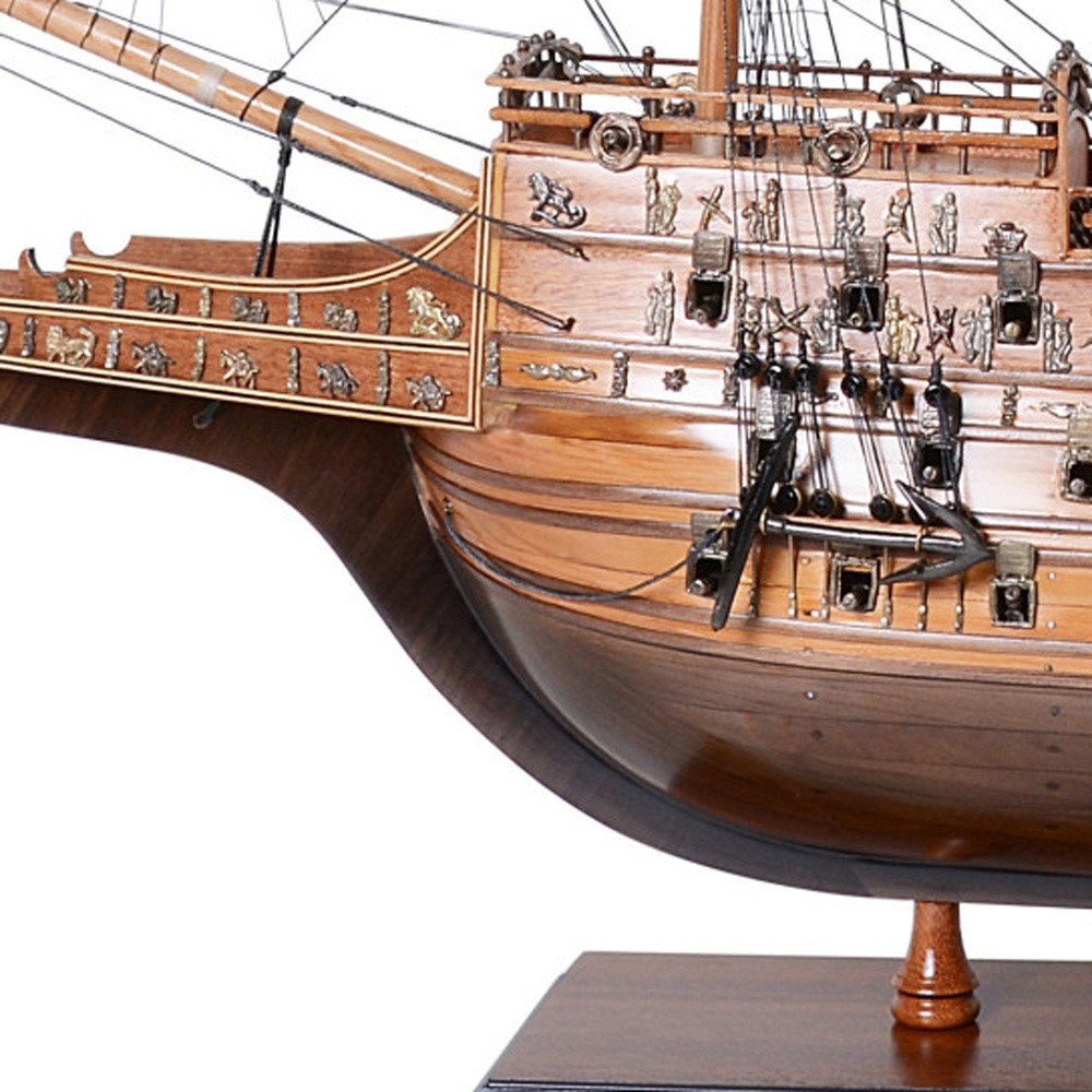 Atractivo e increíblemente detallado, el Sovereign of the Seas L es un modelo único, construido a mano, del legendario buque insignia de la Marina Real Británica del siglo XVII. Fabricado a mano por artesanos de gran talento, utilizando maderas de alta calidad como cedro rojo occidental, palo rosa y caoba. Cada modelo requiere cientos de horas de minuciosa construcción y detallado de tablas sobre cuaderna. Incluye detalles increíbles como tres cubiertas, tres filas de cañones a cada lado, velas de lino cosidas a mano y una exquisita ala del almirante con detalles meticulosos. Incluye una base de madera maciza y una placa de identificación de latón. Al ser una "Edición Exclusiva", cada modelo tiene su propio número de serie que permite consultar la fecha de producción, los materiales y otra información. Es una verdadera joya para cualquier coleccionista o aficionado a la navegación. 82,5 cm de alto x 89,5 cm de ancho x 29,5 cm de profundidad.