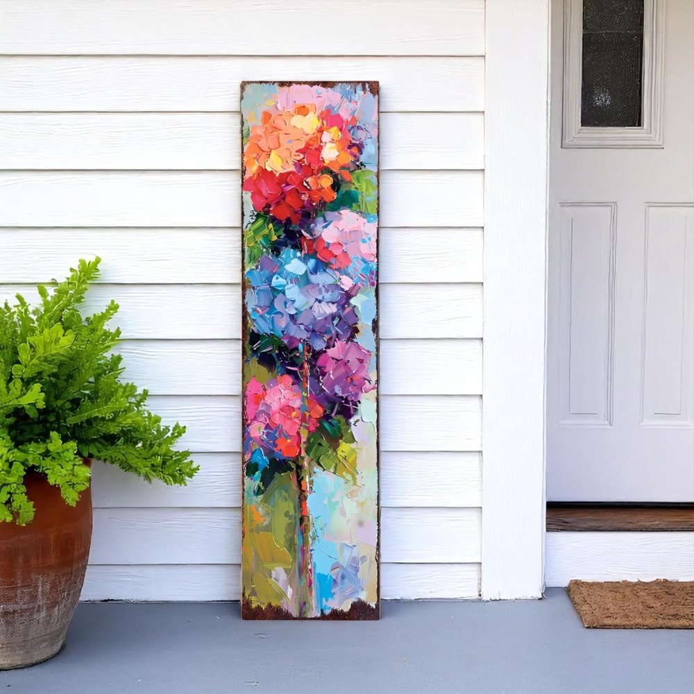 El letrero de porche de madera maciza de 91 cm con hortensias azules, moradas y rojas añade un toque vibrante a su espacio exterior. Fabricado en madera maciza, este letrero está diseñado para resistir las inclemencias del tiempo, manteniendo su impresionante apariencia. Su estilo tradicional complementa diversas estéticas del hogar, lo que lo convierte en una opción versátil para cualquier porche o jardín. La impactante combinación de hortensias azules, moradas y rojas crea un atractivo punto focal que da la bienvenida a los invitados con encanto. Perfecto para realzar el ambiente de su decoración exterior, este letrero combina a la perfección funcionalidad y estilo artístico. Realce su jardín con este hermoso accesorio que refleja su estilo personal y realza su experiencia al aire libre. 91 cm de alto x 25 cm de ancho x 2,5 cm de profundidad.