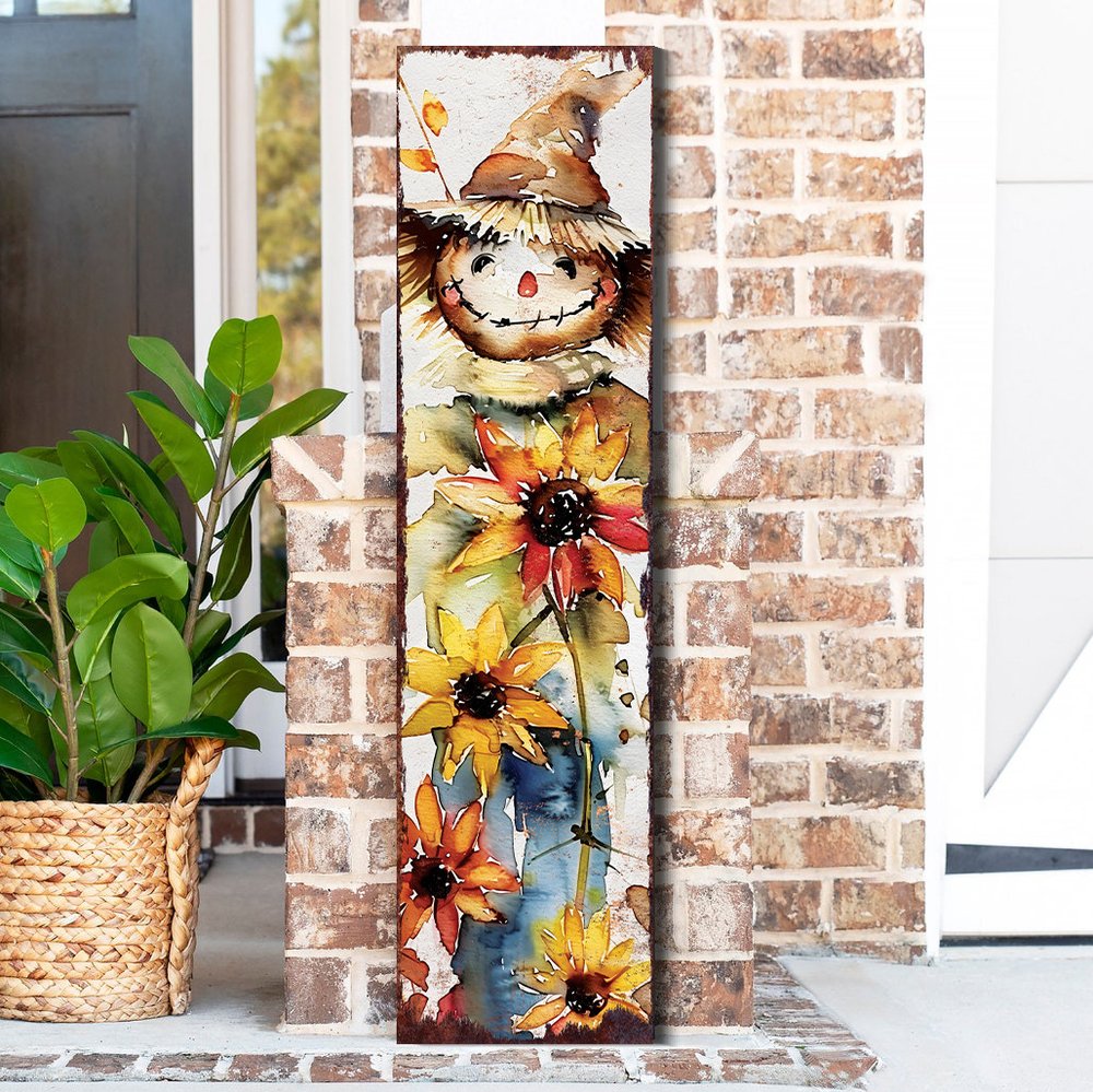 Letrero de porche de madera maciza de espantapájaros marrón, blanco y amarillo de 36"