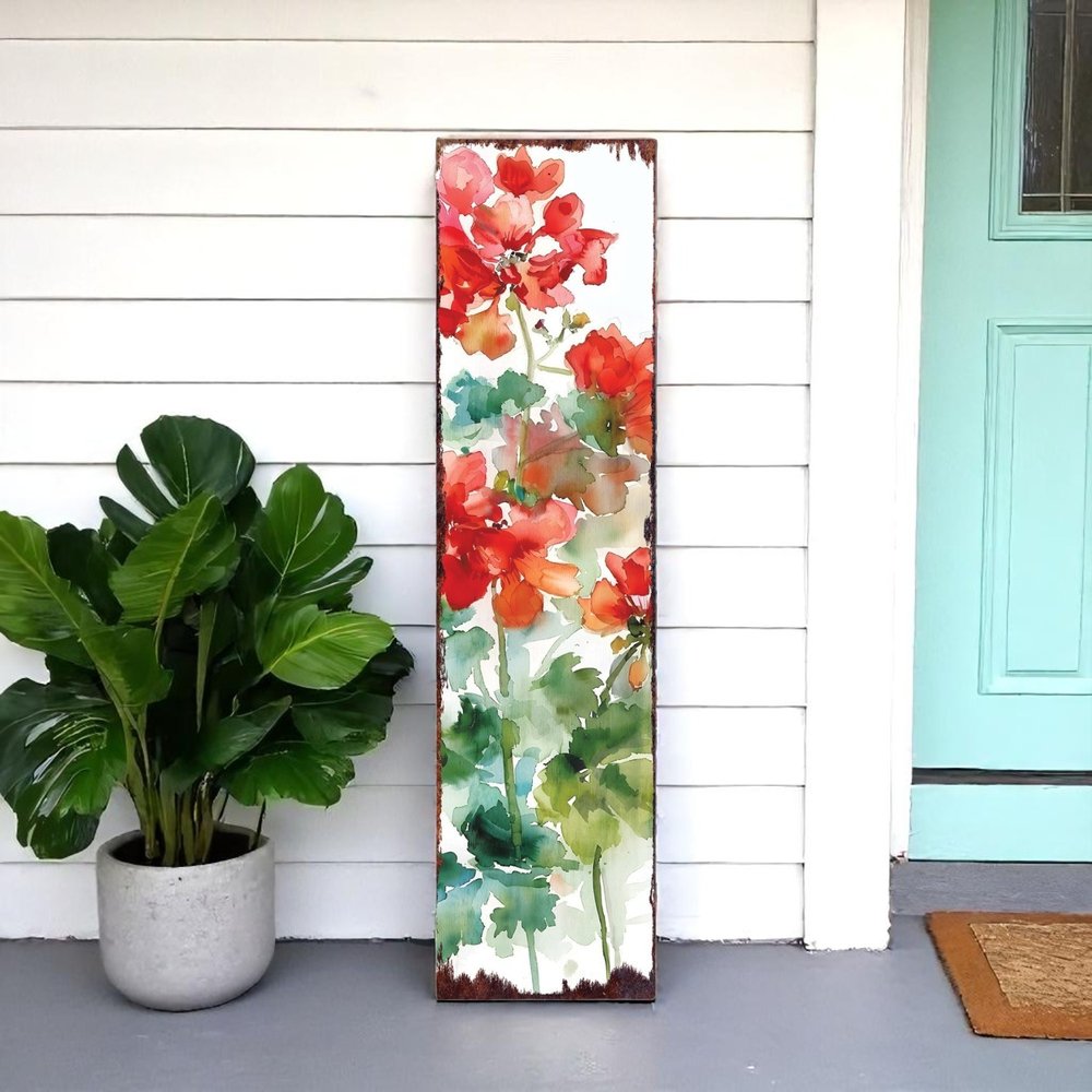 Letrero de porche de madera maciza de 36" con geranio verde, rojo y blanco