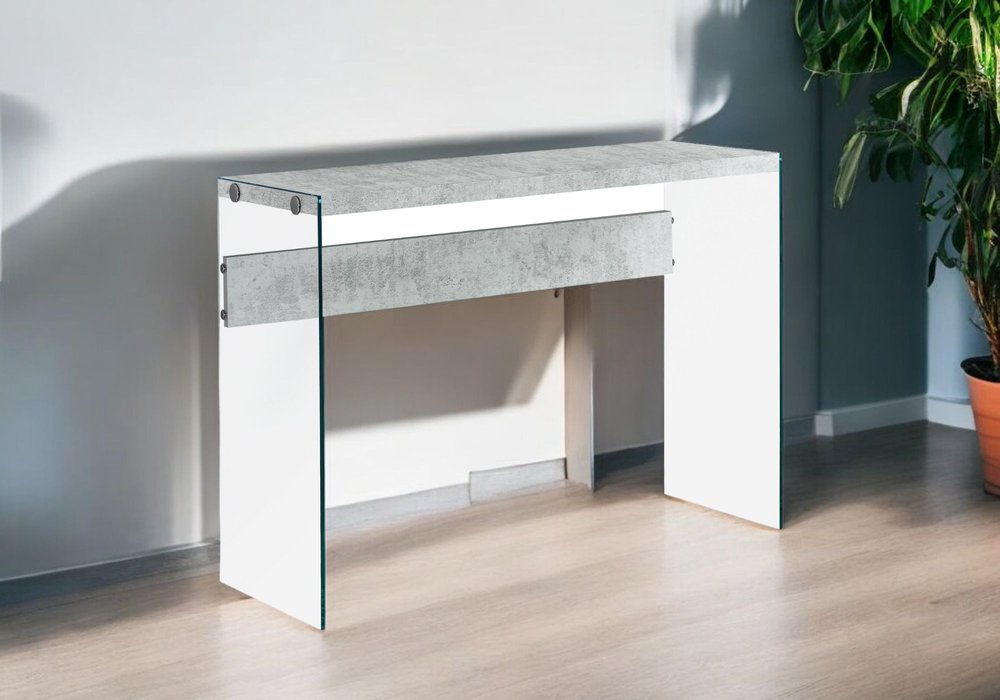 Don't settle for a boring entryway, upgrade your home with our 44-inch gray and clear solid console table today! This rectangular table is ideal for up against the wall, can free stand in a room, or sit behind the sofa perfectly. This table has a top made with gray manufactured wood that is known for durability and easy maintenance. This console table has a solid style glass base, making it an ideal choice for a contemporary home. Versatile in use, console tables can be used for a variety of purposes in a variety of rooms and settings. 32-inch H x 44-inch W x 15.75-inch D