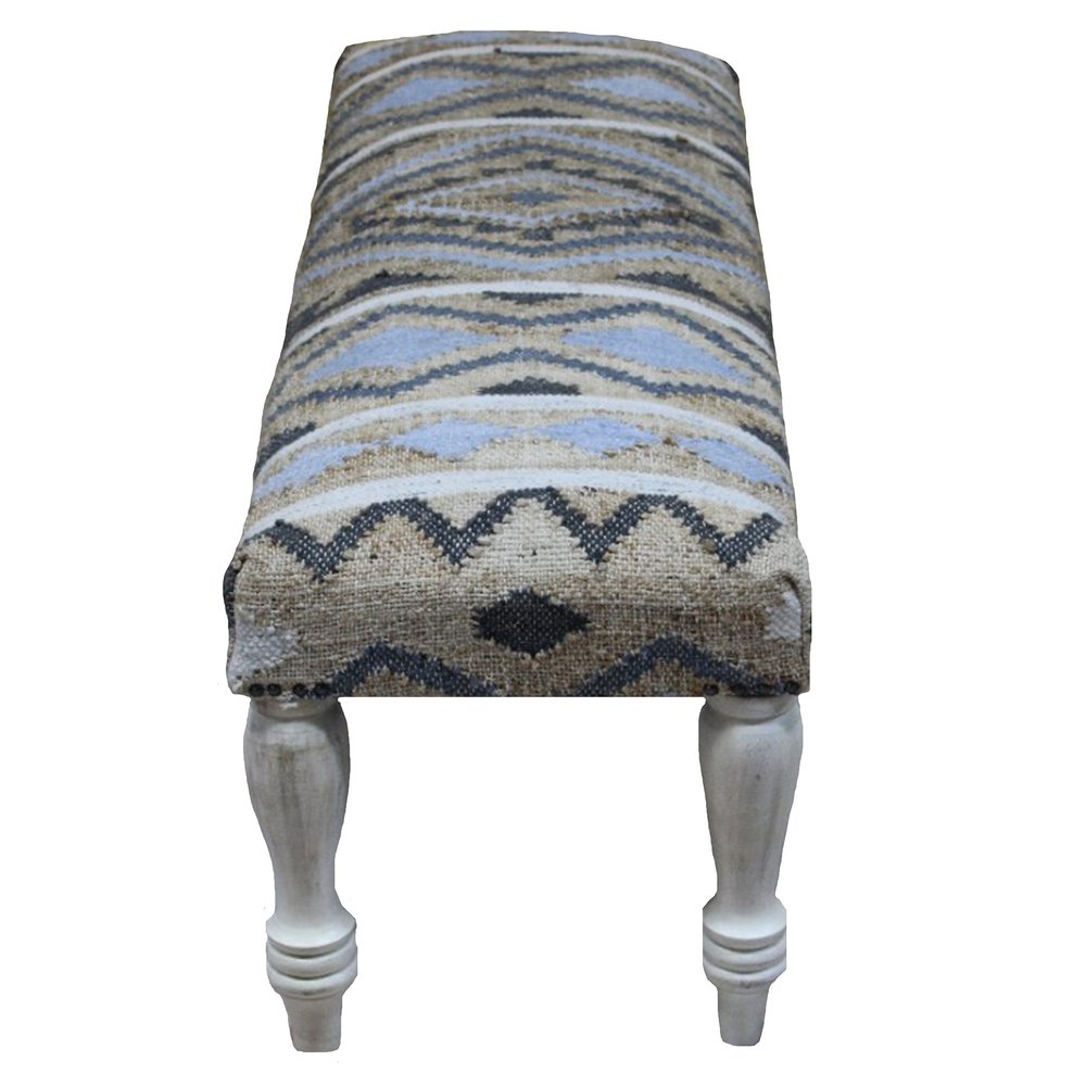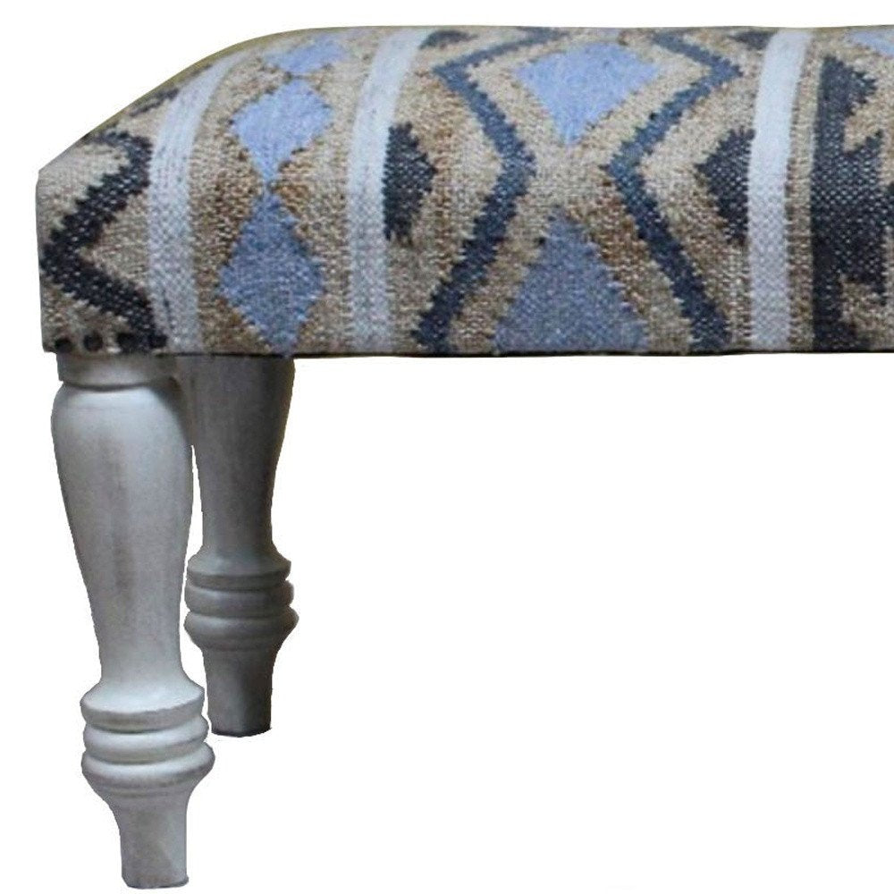 Optimize your space and add some charm to your room with the 47-inch beige, blue and white geometric cotton blend upholstered bench. A rustic white solid wood frame is finished off with a beige and blue upholstery seat that is the epitome of quality construction and design. A purposefully distressed finish gives this versatile bench an authentically rustic feel. Expertly upholstered with padding and soft cotton blend in a geometric pattern, this bench is as comfortable as it is good looking. Ideal for entrance foyer, bedroom, living room, hallway, or lounge. This bench is a great place store your keys, put on your shoes, or be a catchall on your way in or out. Easy to blend into most any room, a bench is a way to add a good-looking accent to your space that can also be practical and useful. 18-inch h x 47-inch w x 16-inch d.
