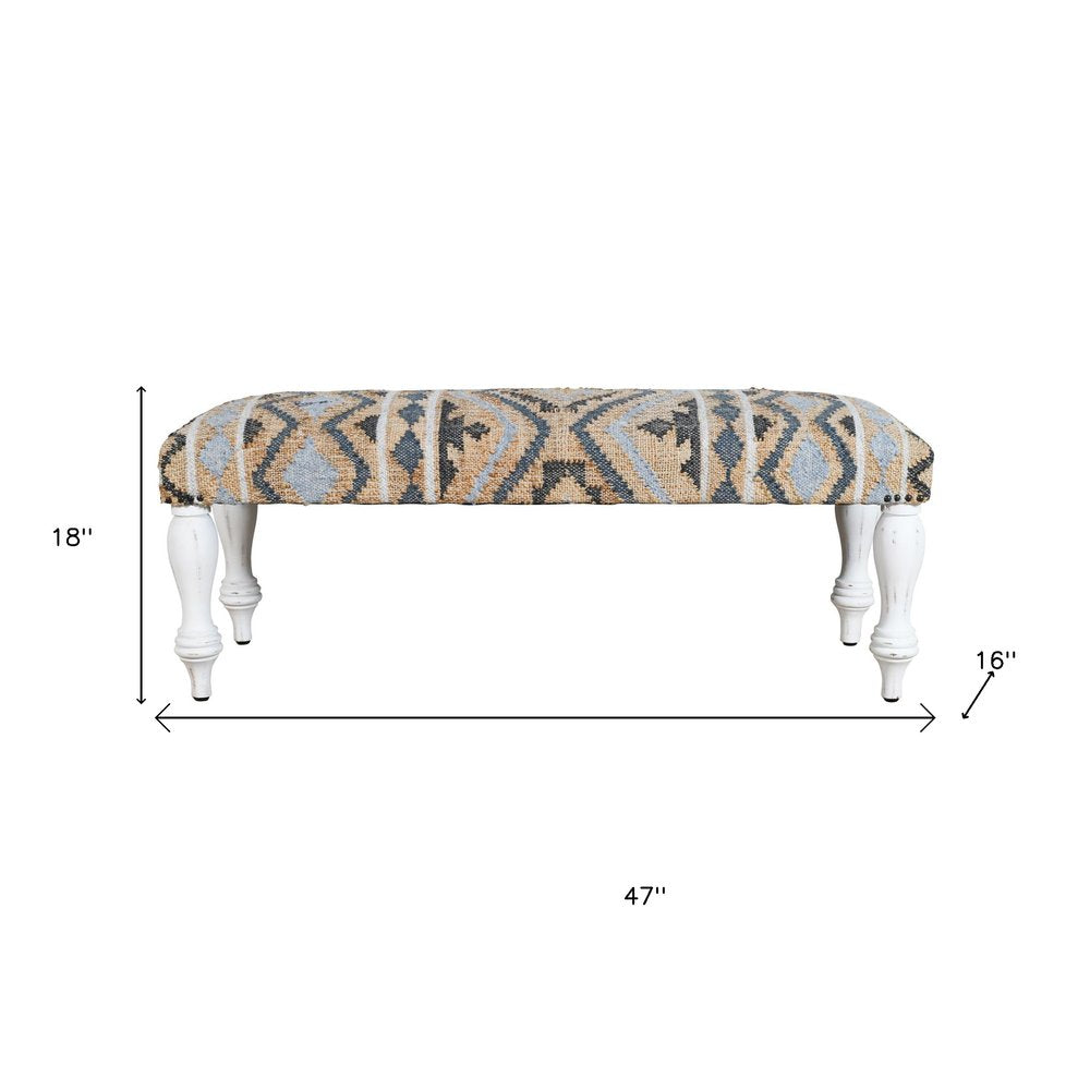 47" Beige Blue and White Geometric Cotton Blend Upholstered Bench