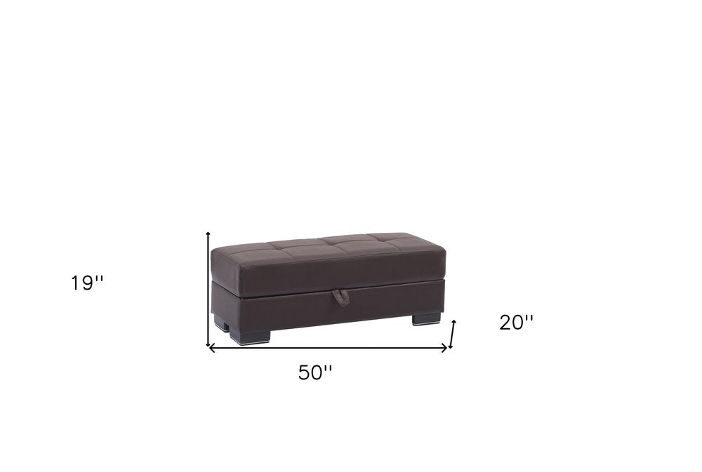 Get ready to relax with this 50-inch brown faux leather tufted storage ottoman. Designed to discretely add hidden storage to your room without sacrificing seating or footrest space. Expertly upholstered with padding in a soft solid color faux leather, this ottoman is as comfortable as it is good looking. Easy to blend into most any room, an ottoman is a way to add a good-looking accent to your space that can also be practical and useful. 19-inch h x 50-inch w x 20-inch d.