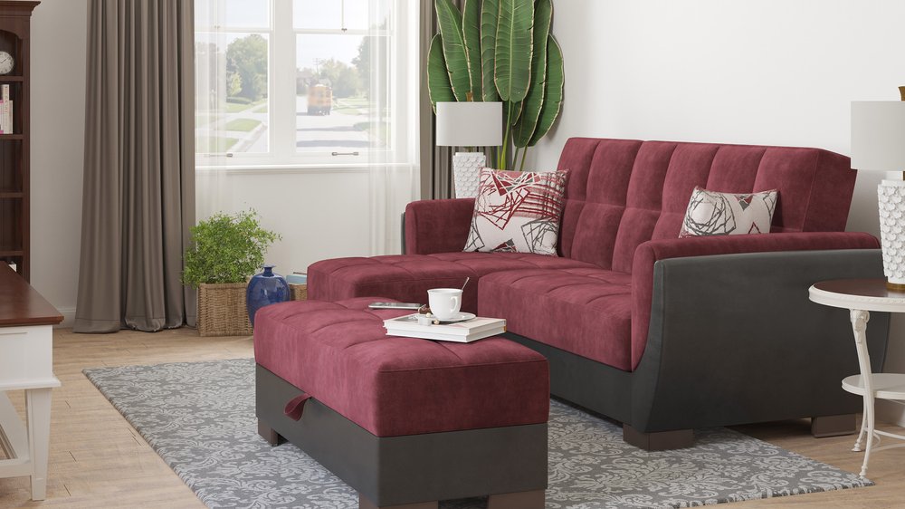 Practicality and fashion mix together with this handy 50-inch burgundy, black and brown faux leather and microfiber tufted storage ottoman. Designed to discretely add hidden storage to your room without sacrificing seating or footrest space. Expertly upholstered with padding in a soft solid color faux leather and microfiber, this ottoman is as comfortable as it is good looking. Easy to blend into most any room, an ottoman is a way to add a good-looking accent to your space that can also be practical and useful. 19-inch h x 50-inch w x 20-inch d.