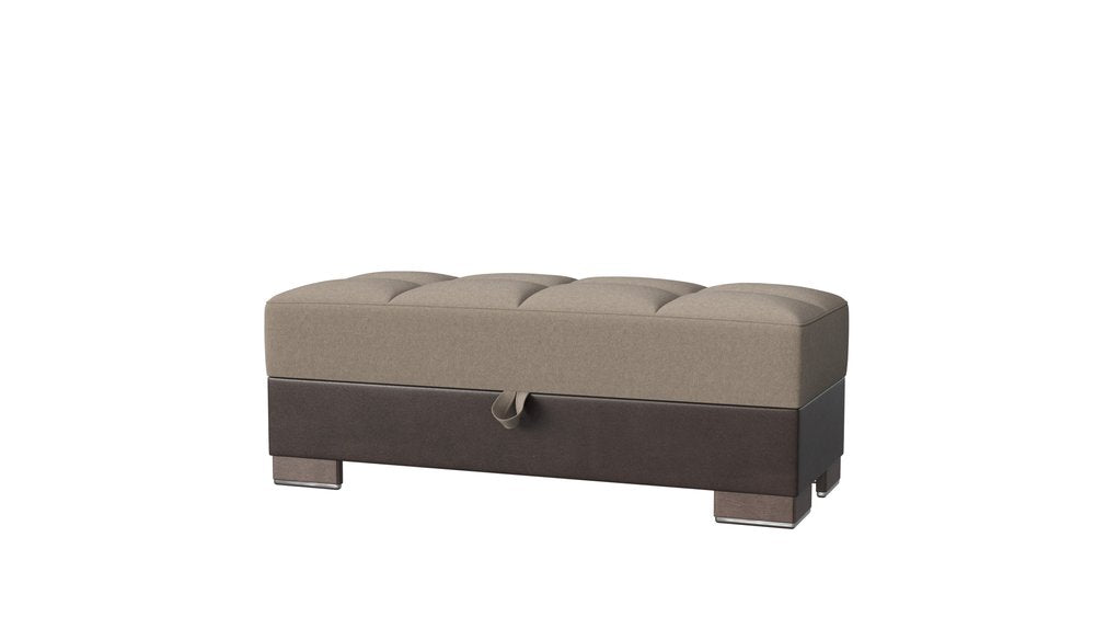 Get ready to relax with this 50-inch tan and brown chenille and faux leather storage ottoman. Designed to discretely add hidden storage to your room without sacrificing seating or foot rest space. The tufted upholstered top of this ottoman lifts to reveal lots of storage space that is ideal for blankets, pillows, games, and more. Easy to blend into most any room, this rectangular bench style ottoman is a way to add an accent to your space that is not only good looking but practical and versatile as well. 19-inch h x 50-inch w x 20-inch d.