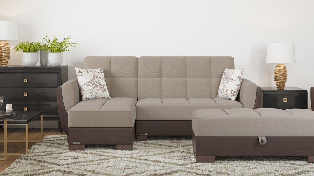 50" Tan and Brown Chenille And Faux Leather Storage Ottoman