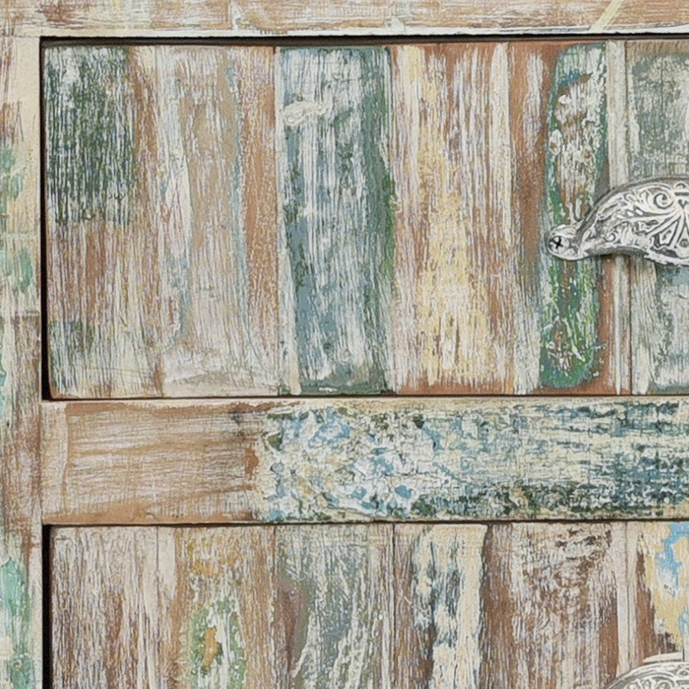 Ready to be enjoyed in most any room, this 50-inch white distressed reclaimed wood open and enclosed storage entertainment center is a practical and good-looking piece of furniture that will help to anchor your room. Designed to be sturdy and long lasting, this versatile furniture piece is hand-crafted from durable reclaimed wood and features a rustic design style. Featuring a natural and white with multiple patinas, the finish is purposefully distressed to give this piece a vintage and rustic feel, this chic media center includes open cubby space and six drawers to offer lots of storage. Ideal for TV placement and storage in your living room, bedroom or office. 42-inch h x 50-inch w x 18-inch d.