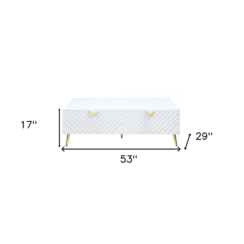 This stylish 53-inch white wood and metal coffee table with four drawers is sure to inspire compliments no matter where it sits. A sleek white monotone color gives this metal and manufactured wood table a fresh and updated look. This classic rectangular table will be a great accent in any room it has an attractive design that will definitely breathe some fresh air into your interior. 17-inch h x 53-inch w x 29-inch d.
