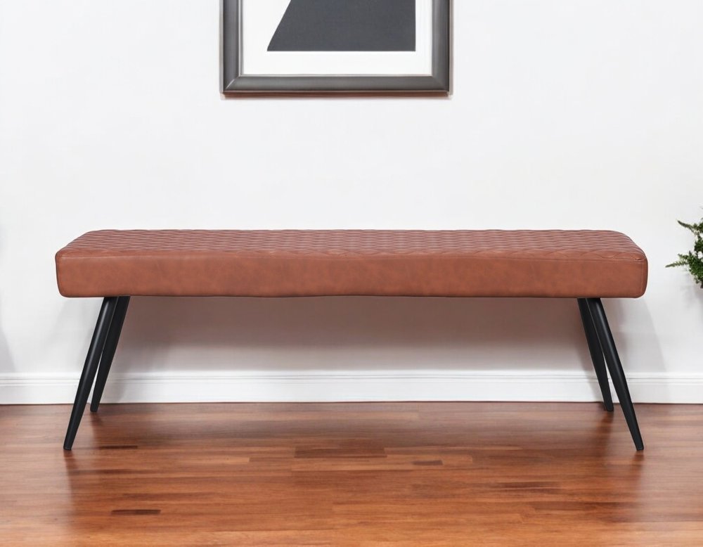 Add a good-looking decorative accent to your space that is also practical for seating. A black metal frame is finished off with a brown tufted faux leather upholstery seat that is the epitome of quality construction and design. Add this bench to your kitchen or dining room for convenient seating at the table. Easy to blend into most any room, a bench is a way to add a good-looking accent to your space that can also be practical and useful. 18.7-inch h x 53.54-inch w x 16.54-inch d.