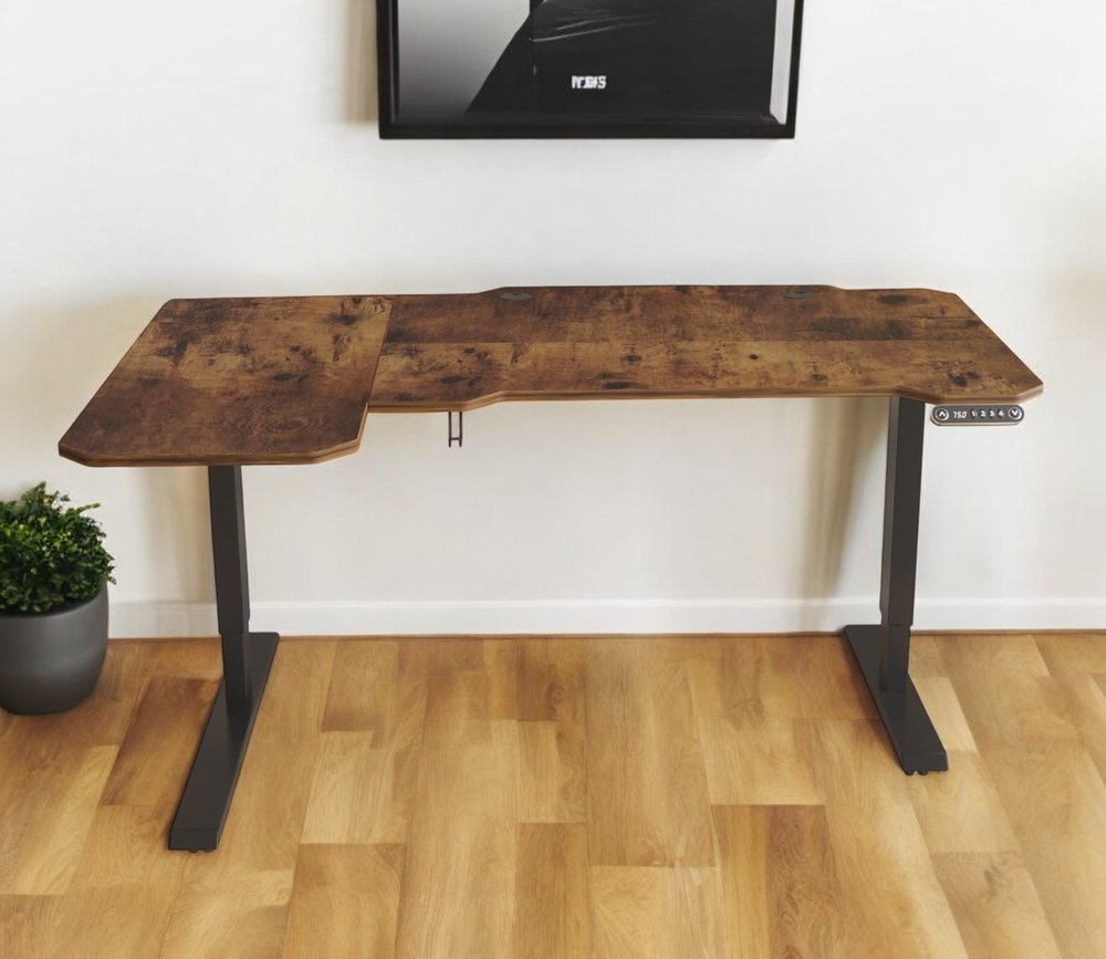 Look like a professional in your workspace with this sleek 59-inch height-adjustable l-shape computer desk in brown and black. Crafted from durable manufactured wood and stainless steel, this modern desk offers efficient cable management and a t-shape base design. The desk provides a comfortable maximum height of 46 inches and a minimum height of 27 inches, ensuring long-term comfort and productivity without compromising style. 46-inch H x 59-inch W x 24-inch D