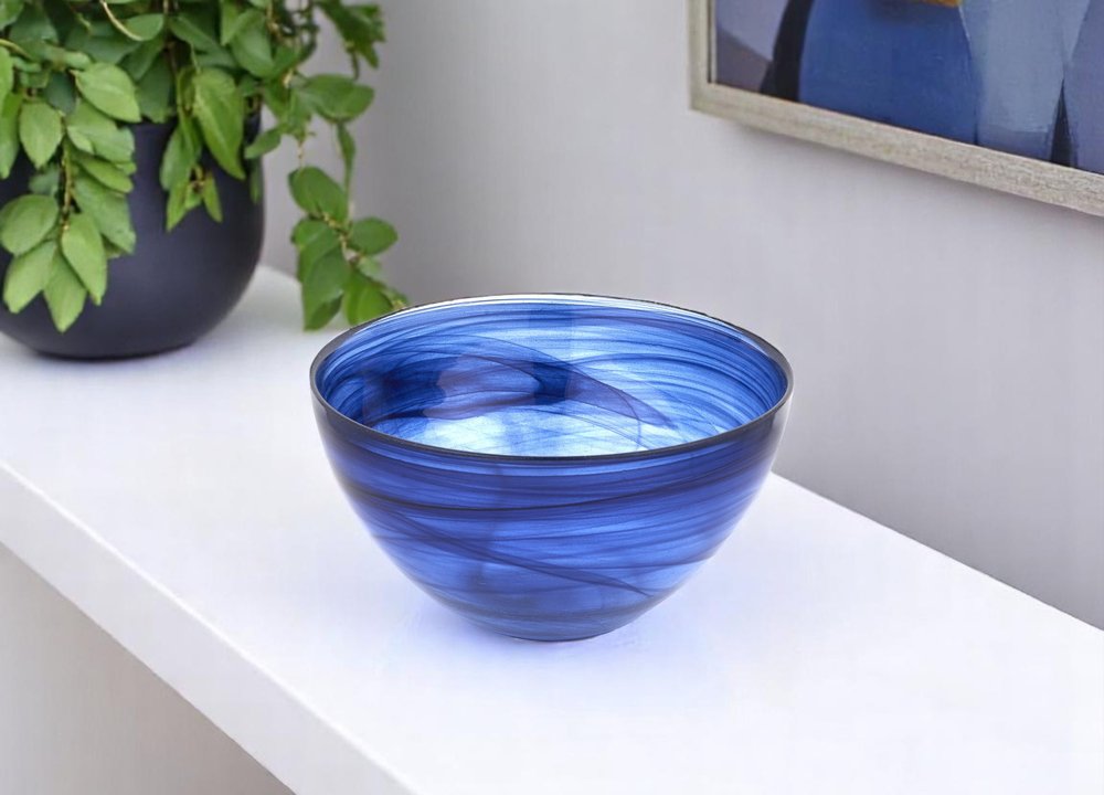 El tazón redondo de 15 cm de vidrio de alabastro blanco y cobalto para dulces o nueces combina elegantemente funcionalidad con estética moderna. Hecho a mano en Europa con vidrio de alabastro de alta calidad, este tazón exhibe una artesanía excepcional y atención al detalle. Diseñado con una forma redonda y suave, realzará la presentación de cualquier cosa que elija para llenarlo o creará una impactante decoración por sí solo. Disfrute de la combinación perfecta de arte y practicidad con este encantador tazón multiusos. 6,35 cm de alto x 15 cm de ancho x 15 cm de profundidad.