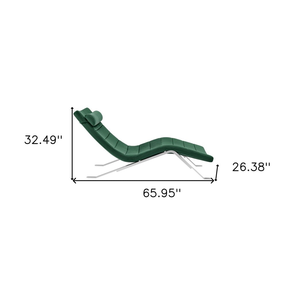 This 66-inch green and silver velvet lounge chair will add a beautiful decorative accent to your decor. This gorgeous solid color green lounge chair is masterfully upholstered in durable velvet. The sturdy inner frame is built with high quality metal, featuring a tufted back that is accented with soft and comfortable cushioning. 32.49-inch h x 65.95-inch w x 26.38-inch d.
