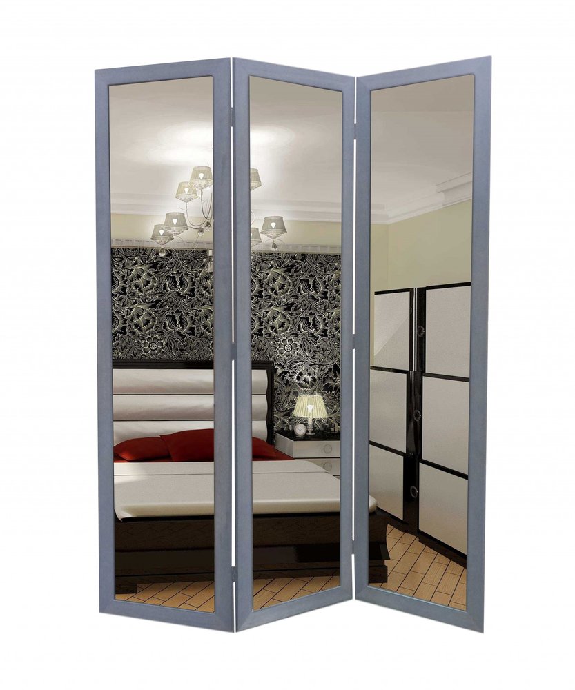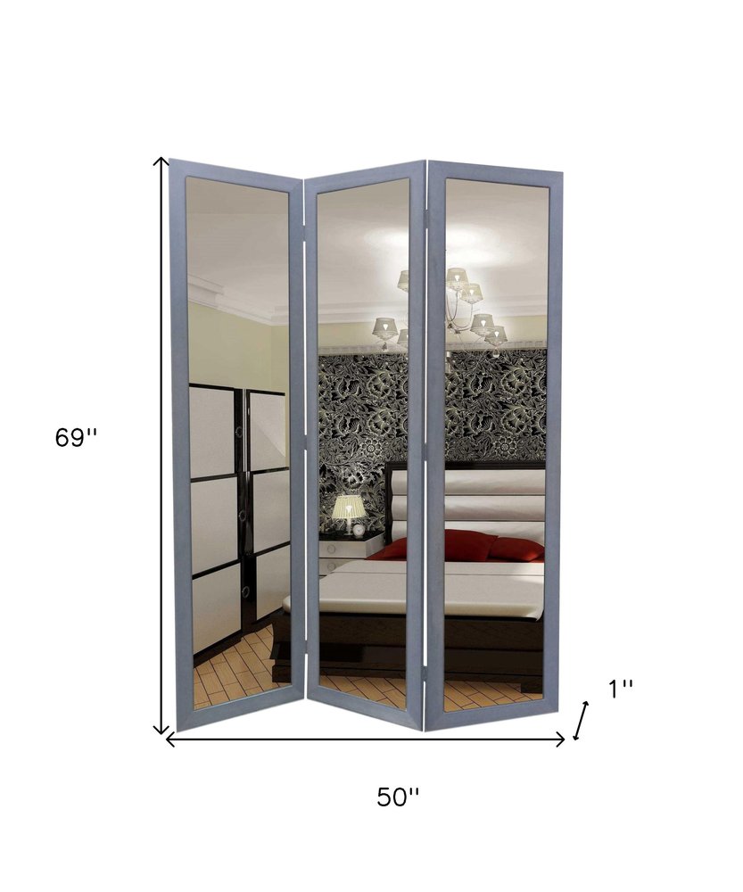 Enhance your living space with this sleek 69-inch black wood and mirrored glass folding three panel screen room divider. Crafted from wood and mirrored glass, this modern style room divider features three panels for added versatility and privacy. The black color adds a touch of chic elegance to any room. Perfect for dividing a room or creating a private nook, this room divider effortlessly combines functionality with style. 69-inch H x 50-inch W x 1-inch D