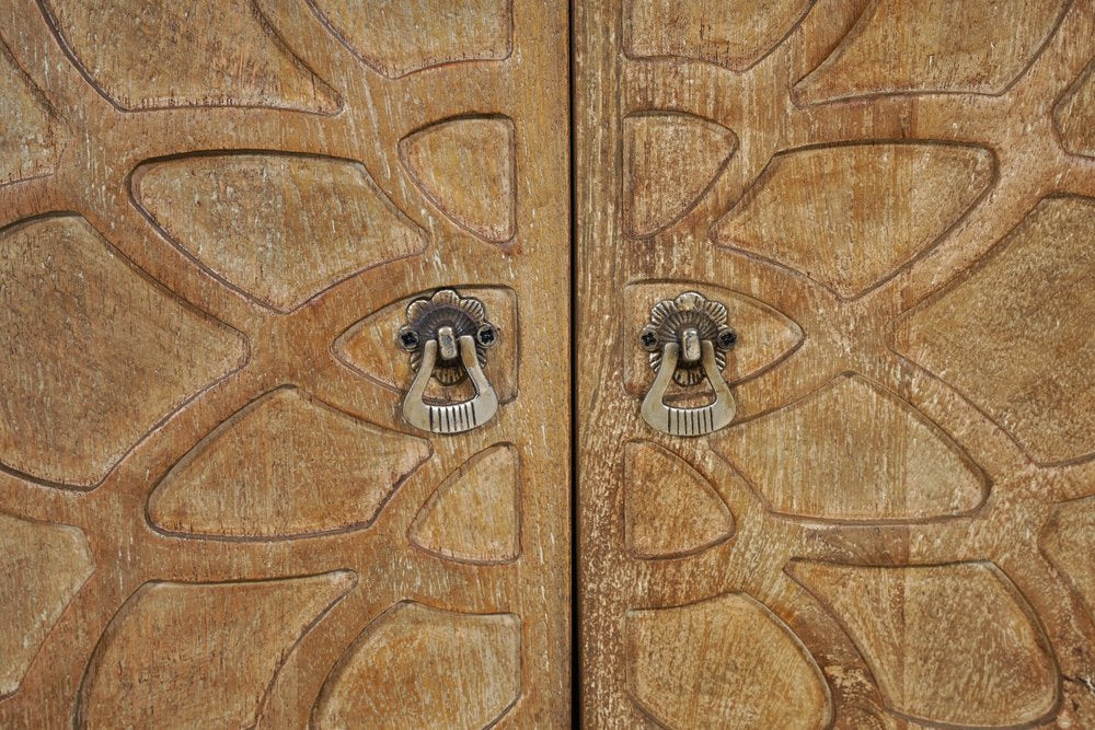 Storage vessels don't have to be unsightly. Increase your storage space and the fashion quotient of your room with this hard wearing, versatile, and good-looking cabinet. Crafted from solid wood, this sideboard showcases a rustic charm that complements any decor. The beautifully carved floral detailing on both the doors and the surface adds an artistic touch. It features spacious shelves for ample storage, ensuring functionality meets style. The rich brown finish with a slight whitewash and distressing enhances the natural grain of the wood, while the brass hardware provides an elegant accent to its overall design. 38.00-inch h x 70.00-inch w x 18.00-inch d.
