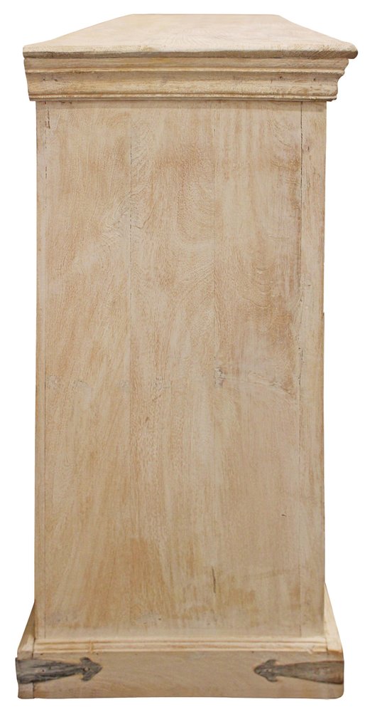 Storage vessels don't have to be unsightly. Increase your storage space and the fashion quotient of your room with this hard wearing, versatile, and good-looking cabinet. Crafted from solid wood, this sideboard boasts a traditional style that complements any decor. The beautiful beige color enhances its charm, while the carved scrollwork provides exquisite textural detailing. With shelves included, it offers ample space for your essentials. The distinctive caved floral door design adds a touch of elegance, and purposeful distressing through wood scoring and rub through ensures a timeless appeal. 35-inch h x 71-inch w x 16-inch d.