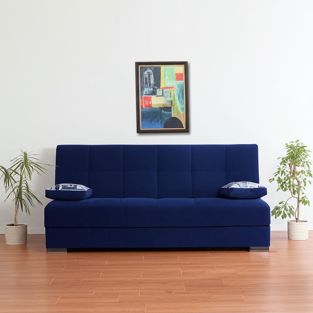 Transform your home's interior with this luxurious 75-inch blue chenille convertible futon sleeper sofa and toss pillows with storage. This solid color convertible futon is made from sturdy and resilient chenille that has a warm and rich look and is a super soft and comfortable to the touch. Solid colors give you lots of decorative options and are easy to work into your decor scheme. Sinuous springs construction gives this piece strong support and makes it comfortable to sit even for long periods of time. Fixed arms offer a comfy place to rest. A great showpiece for your room, this sofa is a must have. 37.8-inch h x 74.8-inch w x 42.1-inch d.