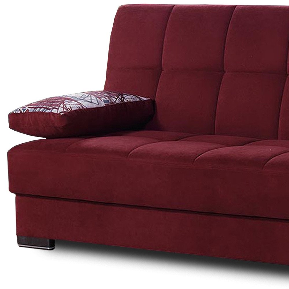 Designed for comfort and good looks, this 75-inch burgundy chenille convertible futon sleeper sofa and toss pillows with storage is a great option to anchor your space. With a warm and rich look to it, this solid color convertible futon is upholstered in chenille that is designed to be super soft to the touch, sturdy and resilient. Solid colors give you lots of decorative options and are easy to work into your decor scheme. Sinuous springs construction gives this piece strong support and makes it comfortable to sit even for long periods of time. Fixed arms offer a comfy place to rest. Built to last, this sofa will be a great centerpiece for your room. 37.8-inch h x 74.8-inch w x 42.1-inch d.