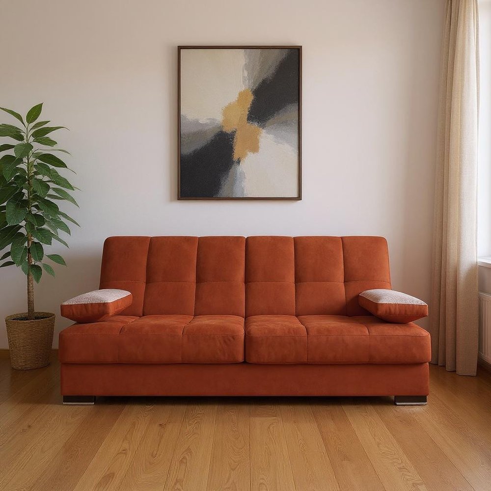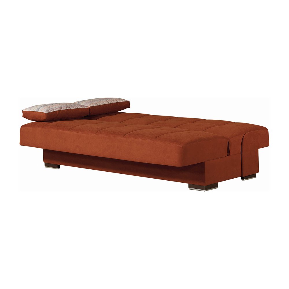 Designed for comfort and good looks, this 75-inch orange chenille convertible futon sleeper sofa and toss pillows with storage is a great option to anchor your space. With a warm and rich look to it, this solid color convertible futon is upholstered in chenille that is designed to be super soft to the touch, sturdy and resilient. Solid colors give you lots of decorative options and are easy to work into your decor scheme. Sinuous springs construction gives this piece strong support and makes it comfortable to sit even for long periods of time. Fixed arms offer a comfy place to rest. Built to last, this sofa will be a great centerpiece for your room. 37.8-inch h x 74.8-inch w x 42.1-inch d.