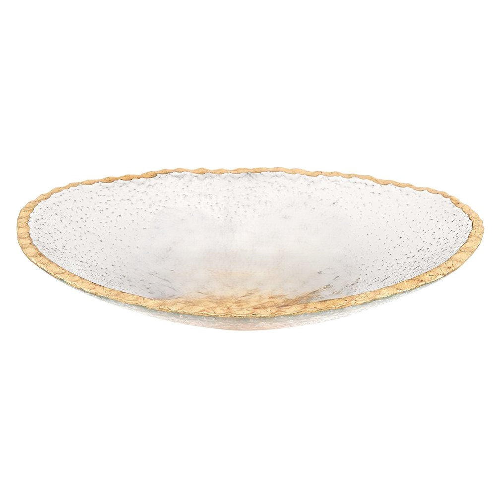 Con un hermoso borde festoneado pintado a mano por hábiles artesanos, este tazón especial está elaborado con el mejor vidrio para crear una apariencia moderna e impactante. Su forma ovalada lo hace ideal para presentar ensaladas, frutas o refrigerios en reuniones. Su estilo contemporáneo combina a la perfección con diversas decoraciones, aportando un toque de elegancia a su mesa. La combinación de colores transparente y dorado realza su atractivo visual y lo hace versátil para cualquier ocasión. 5 cm de alto x 20 cm de ancho x 30 cm de profundidad.