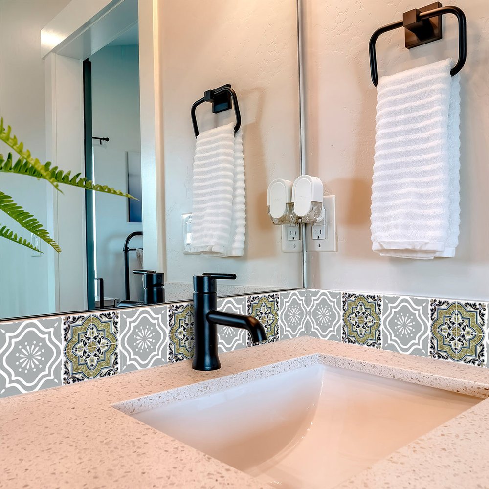 The possibilities are endless with these 8" x 8" Vintage Sage Medallion Peel and Stick Removable Tile stickers. These fabulous peel and stick tiles will add sophisticated flair and design to your kitchen backsplash, fireplace mantel, stair treads, half wall, bathroom or nook. These 8" square tile stickers are an easy, no mess solution to complete a personalized and colorful room makeover. Easy to apply on any clean dry flat surface, and easy to remove. Multi use and multi-room appeal make this design option is perfect for renters, landlords, college students and homeowners alike. Peel and stick tile decals make it easy to turn your space into a home. Removable without damage to surfaces. One kit contains 24 stickers. Kit includes a single repeating design.