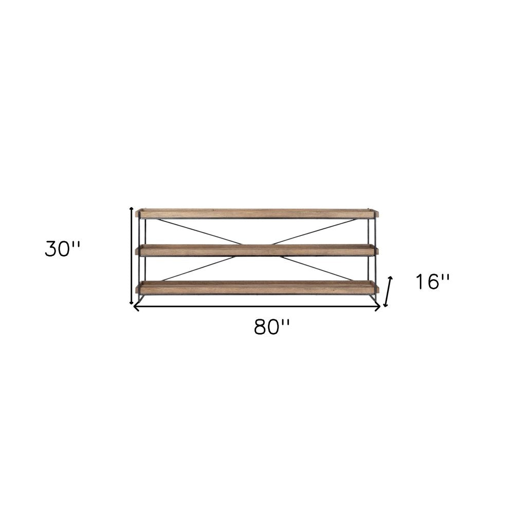 80" Light Brown and Black Solid Wood and Iron Console Table With Two Shelves