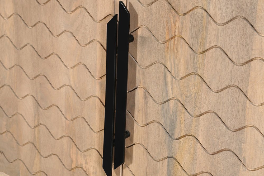 Storage vessels don't have to be unsightly. Increase your storage space and the fashion quotient of your room with this hard wearing, versatile, and good-looking cabinet. Crafted from solid wood, this sideboard combines durability with timeless elegance. Its beautiful beige finish adds warmth to any decor, while the carved wavy geometric detailing brings an element of sophistication. The spacious shelves provide ample storage for your essentials, making organization effortless. Featuring a modern and contemporary style with a unique design that includes black metal legs that resemble tree branches. 36.00-inch h x 84.00-inch w x 18.00-inch d.